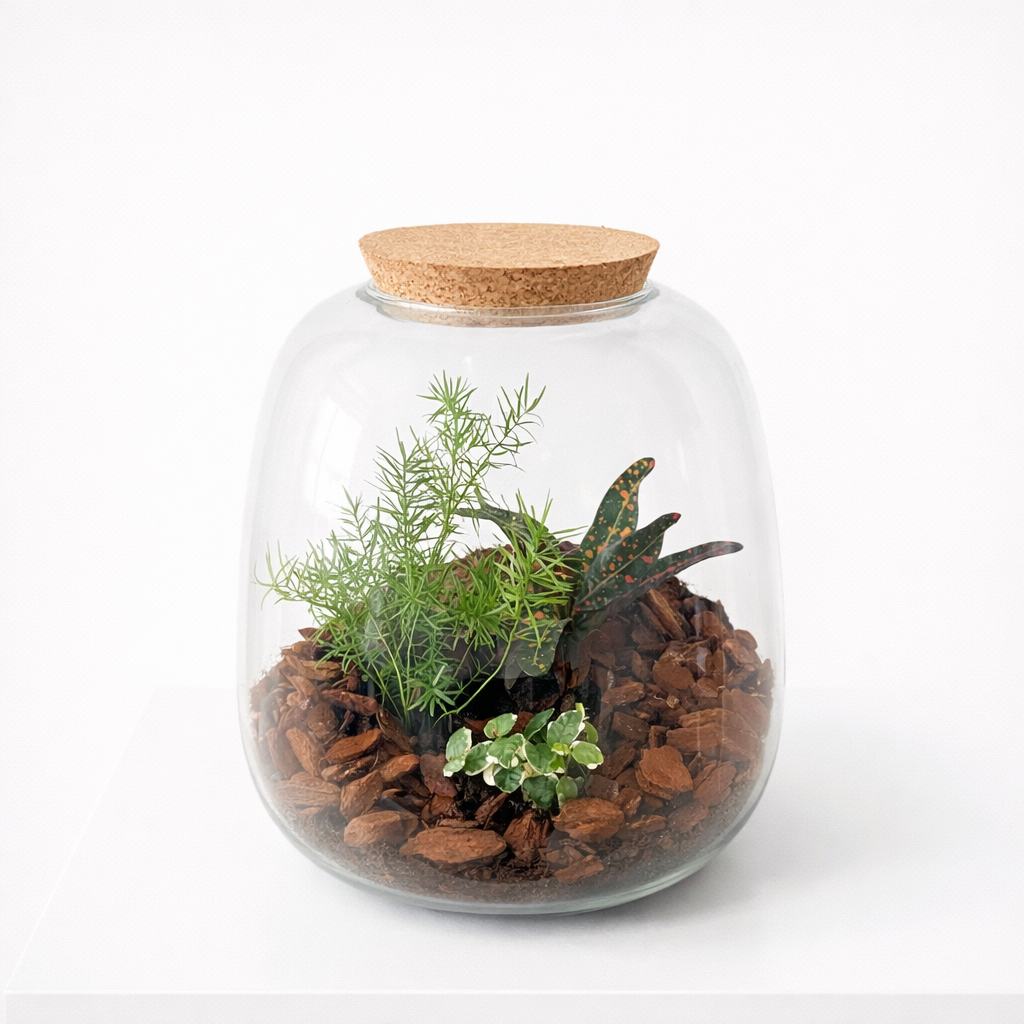 Dette terrarie indeholder et helt mini økosystem (mikroorganismer, jord, vandcyklus, og organisk materiale) i sig selv. Det vil sige, at det er et selvbærende miljø, som kræver meget lidt arbejde for at det trives.