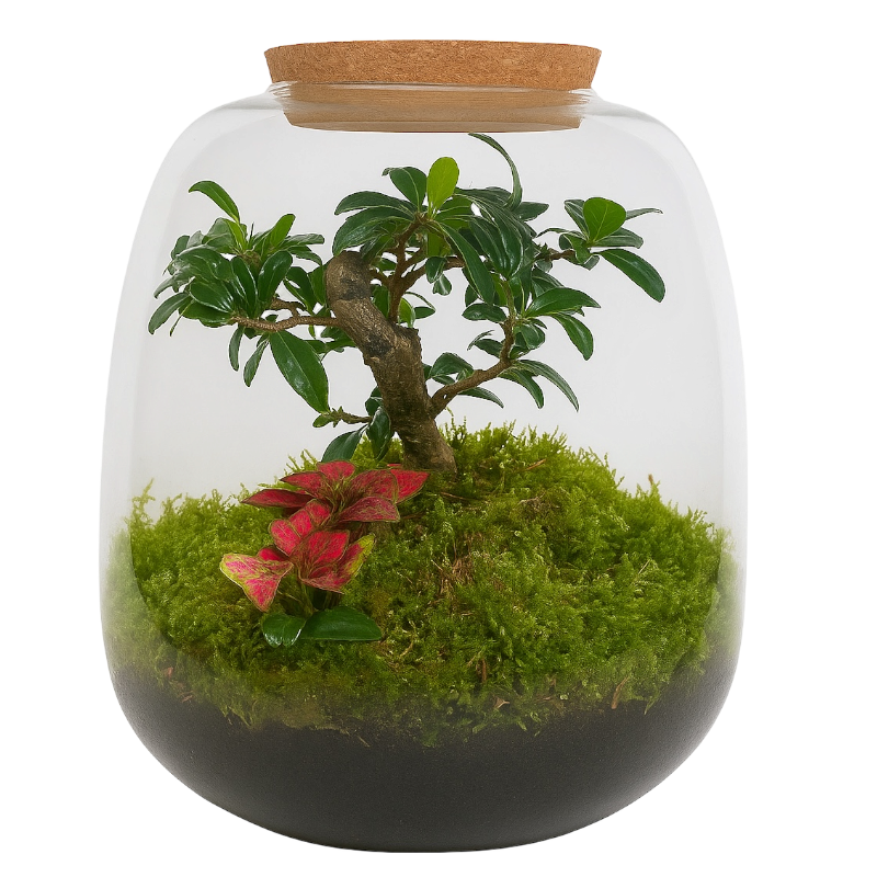 Biosfære med bonsaitræ og mos – Lukket jordbaseret økosystem